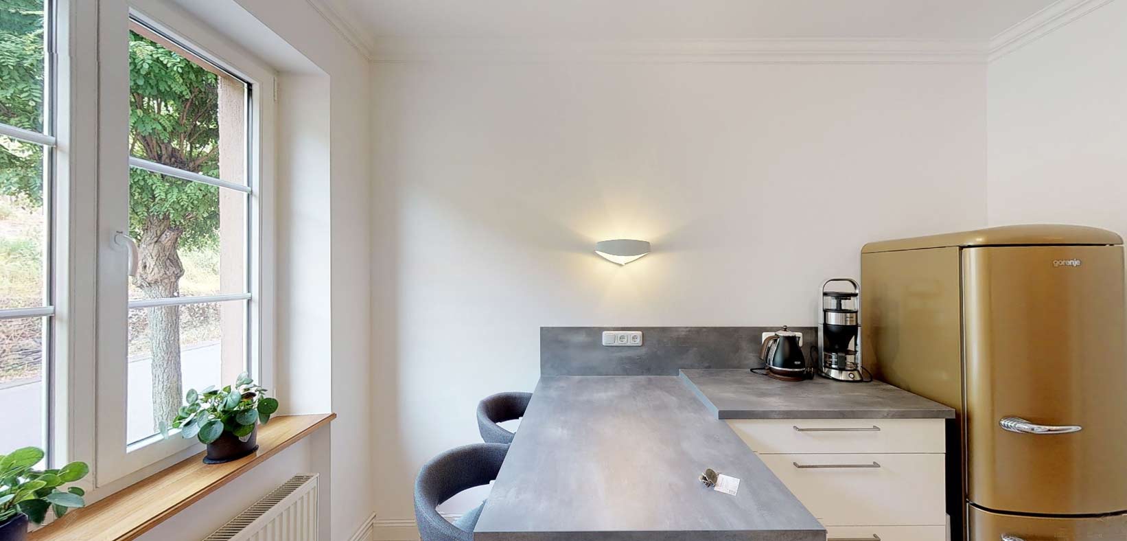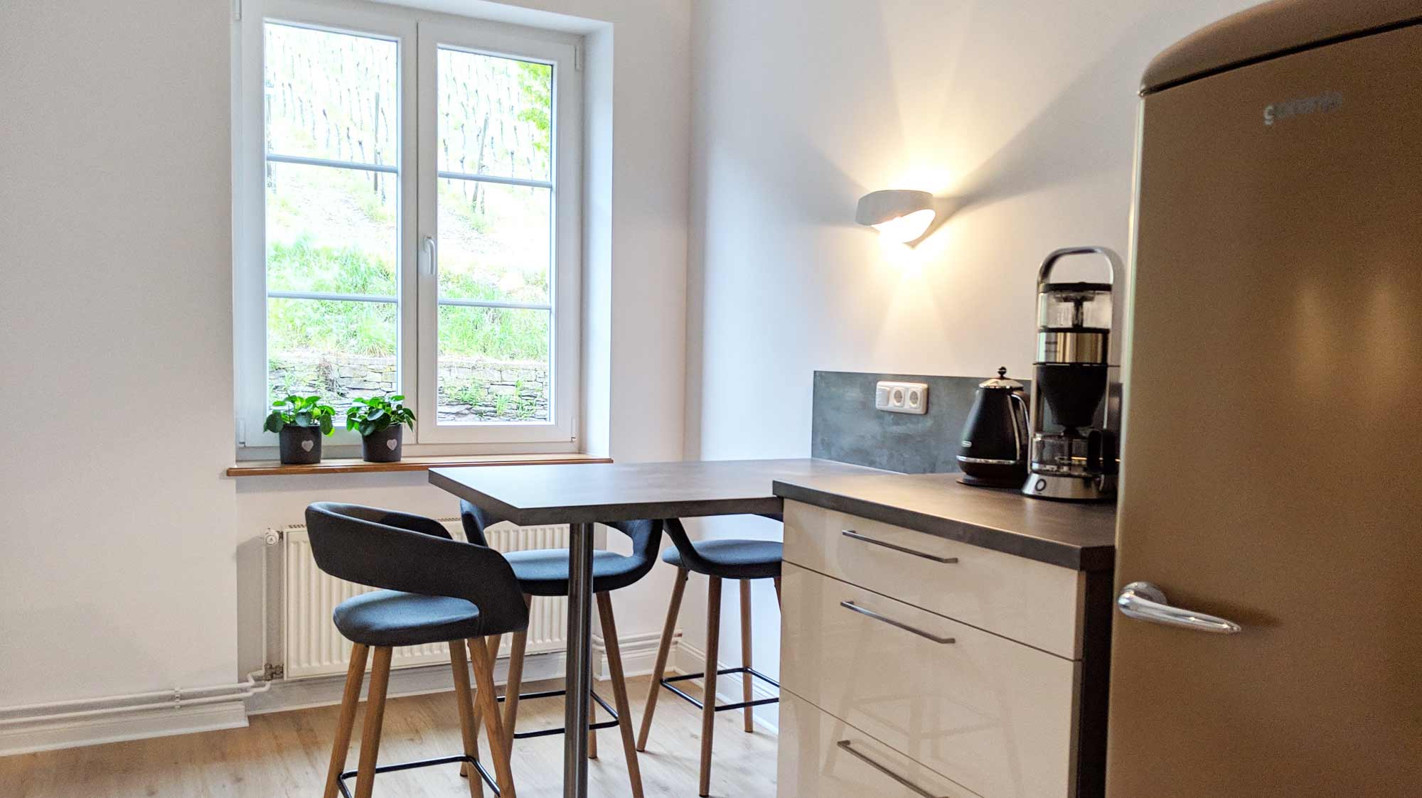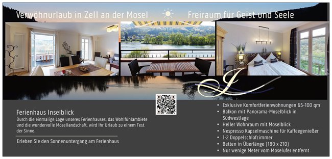 Hier werden Sie sich vom ersten Augenblick an wohlfühlen. Der helle, große Wohnraum bietet luxuriösen Komfort und Moselblick von der Couch aus. Die moderne Markenküche ist komfortabel ausgestattet. Herd mit Backofen und Ceranfeld, Mikrowelle, großer Toaster, Wasserkocher, Retro-Kühlschrank mit Gefrierkombination, Standmixer (Smoothie-Maker), Kaffeemaschine, für Kaffeegenießer eine Nespresso Kapselmaschine mit Milchschäumer und eine Kaffeebar mit Tresenstühlen. Die beiden Schlafzimmer sind mit großen Doppelbetten (180×210 oder 200×210) in Überlänge, ohne Fußteil und mit 2 Matratzen ausgestattet; ein Schlafraum mit Flachbild-TV, bodentiefem Fenster und Moselblick. Zweiter Schlafraum mit Blick in die Weinberge. Elegante Bäder mit großer Luxus-Glasdusche, WC, schönem Waschtisch, Fön, Kosmetikspiegel und eingebautem Radio.