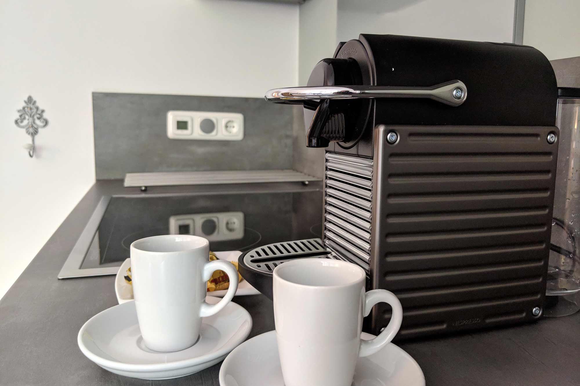 - Zur herkömmlichen Kaffeemaschine für Genießer eine Nespresso Kapselmaschine und ein Michschäumer, auf Wunsch eine Kaffee Padmaschine