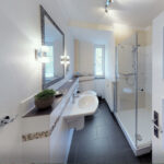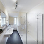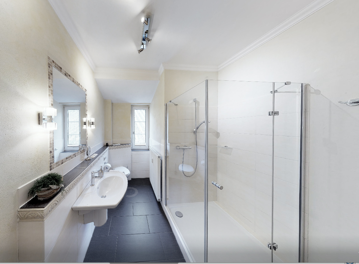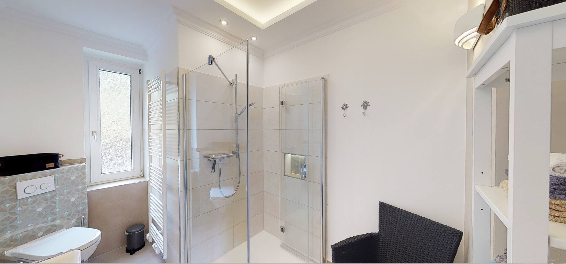- Luxuriöses Bad mit großer Glasdusche, WC, eingebautem Radio, Fön, Aussenfenster