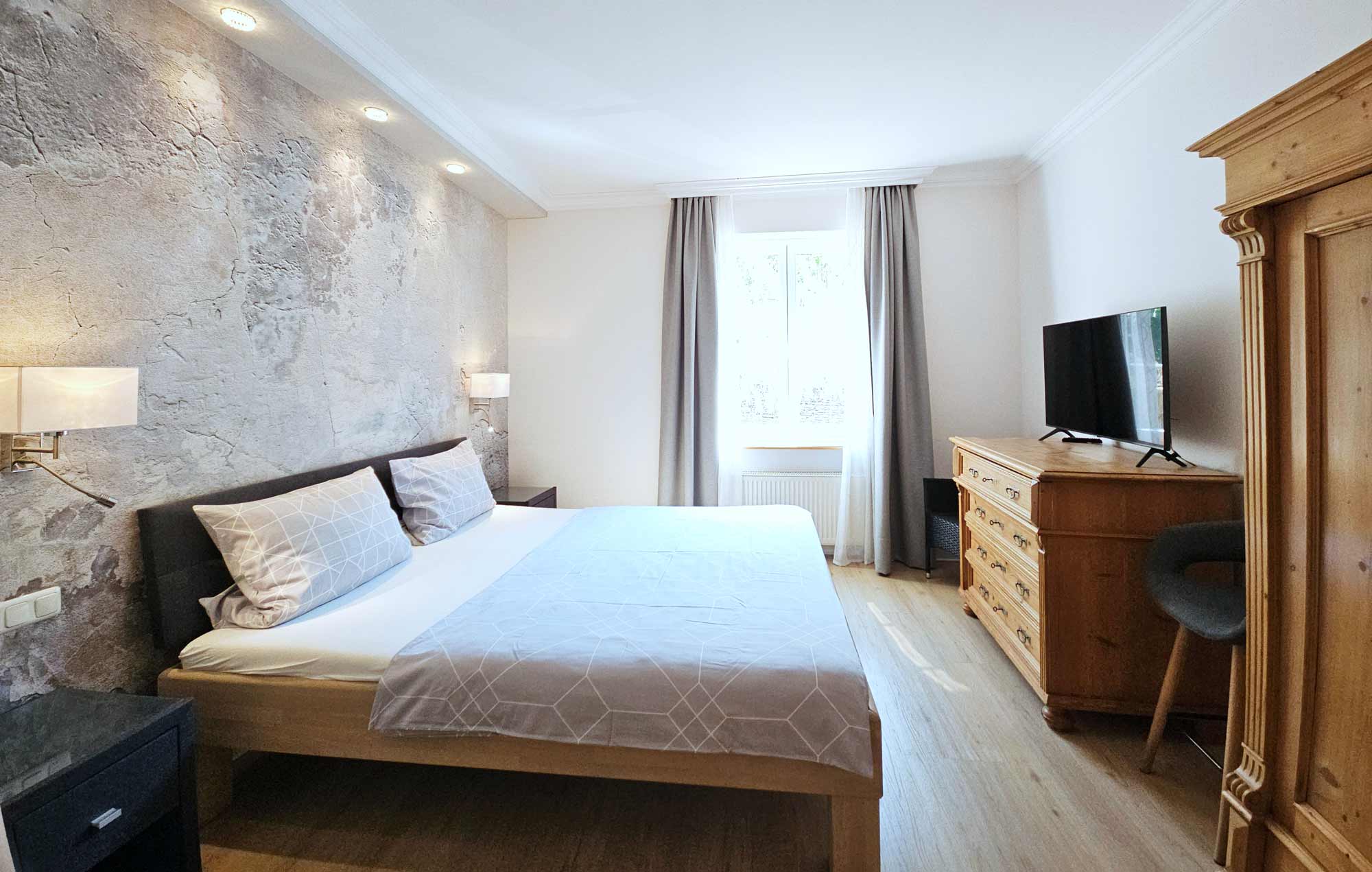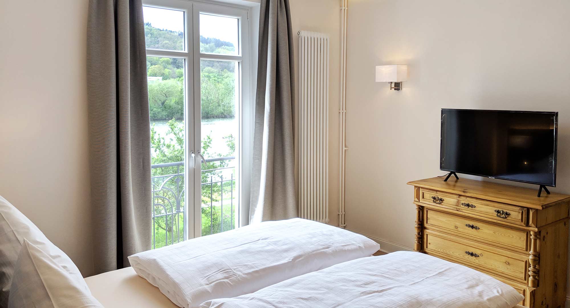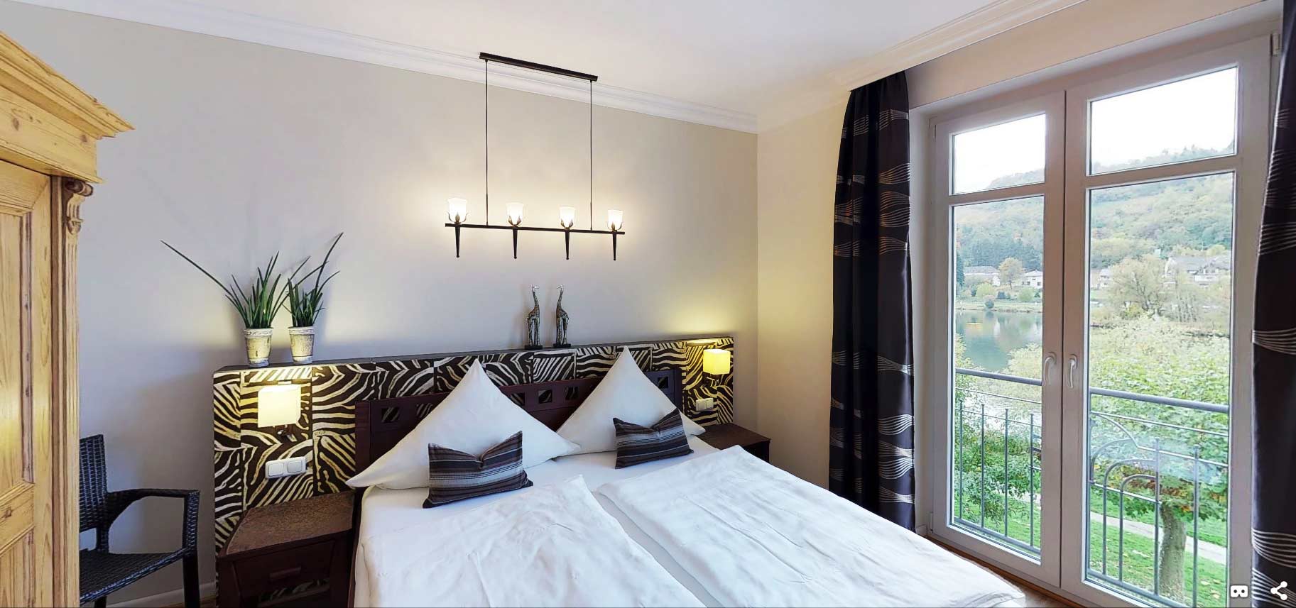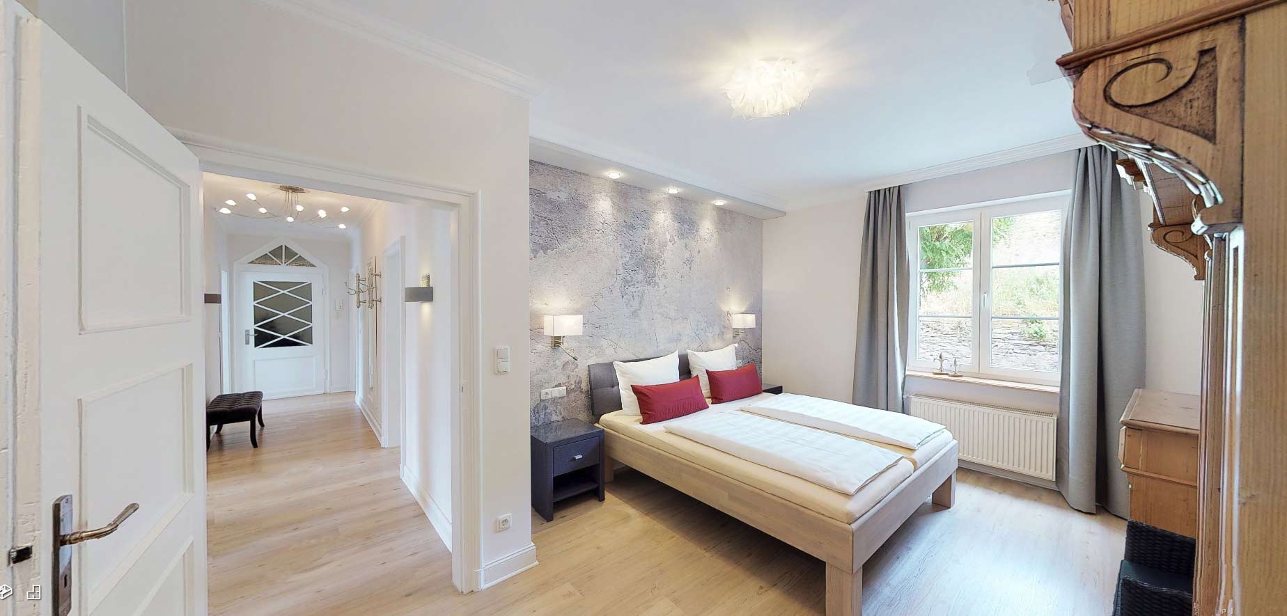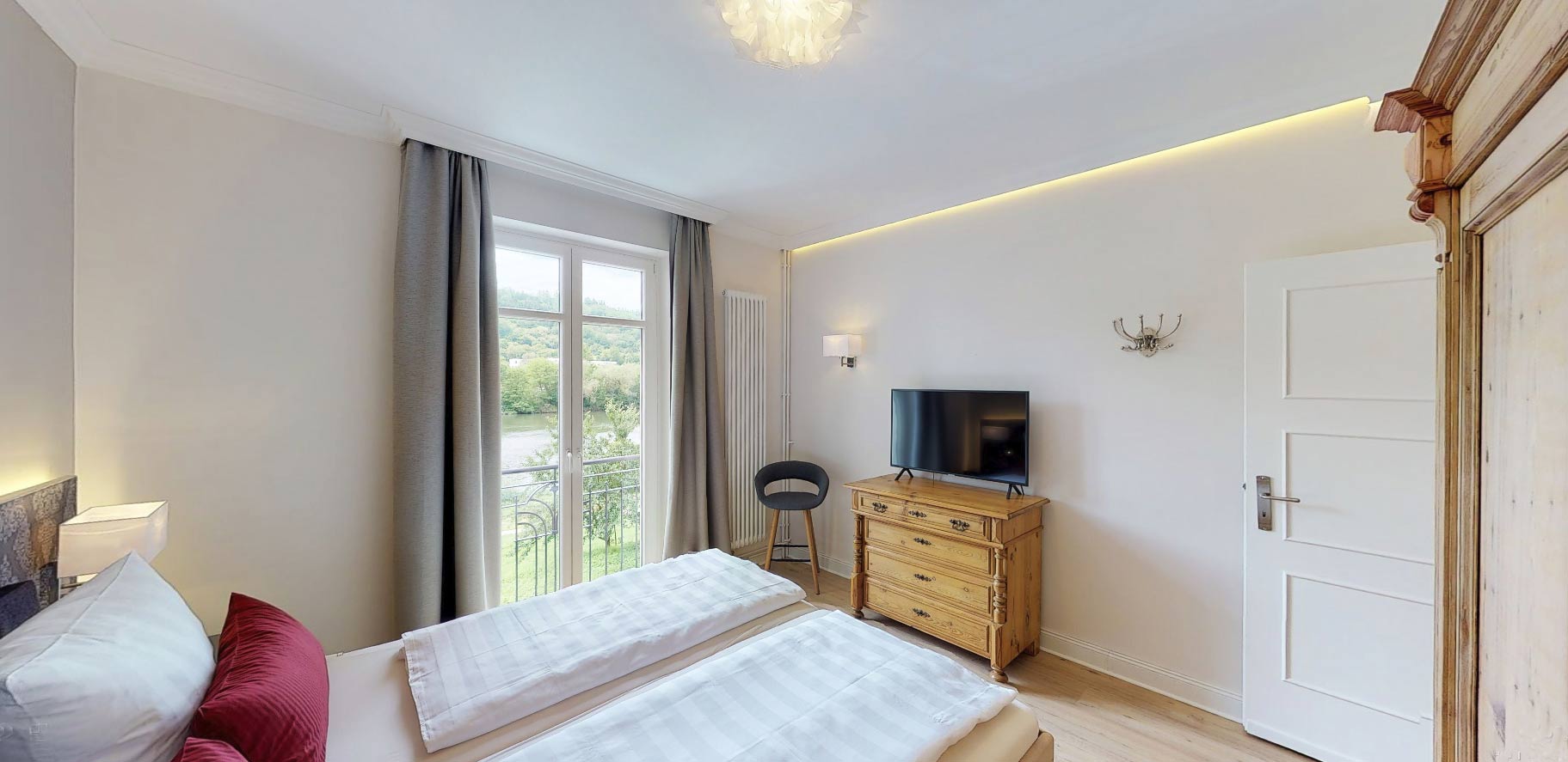 - 1 Schlafzimmer mit großem Doppelbett (180×200), Moselblick, Falchbild-TV